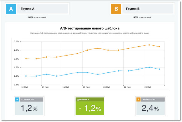 Пульс конверсии. Конверсия — основной показатель качества работы интернет-проекта. Увидеть конверсию сайта теперь можно в режиме реального времени. В новой версии появился инструмент, который показывает конверсию сайта за выбранный период времени и аналитику по каждому из каналов привлечения клиентов: контекстной рекламы, SEO, триггерных рассылок и мобильного трафика. Конверсию также можно оценить для пользователей в зависимости от типа устройств — компьютера, планшета или смартфона. Результат отображается в «пульсе конверсии» — индикаторе изменения конверсии сайта.