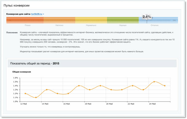 Пульс конверсии. Конверсия — основной показатель качества работы интернет-проекта. Увидеть конверсию сайта теперь можно в режиме реального времени. В новой версии появился инструмент, который показывает конверсию сайта за выбранный период времени и аналитику по каждому из каналов привлечения клиентов: контекстной рекламы, SEO, триггерных рассылок и мобильного трафика. Конверсию также можно оценить для пользователей в зависимости от типа устройств — компьютера, планшета или смартфона. Результат отображается в «пульсе конверсии» — индикаторе изменения конверсии сайта.