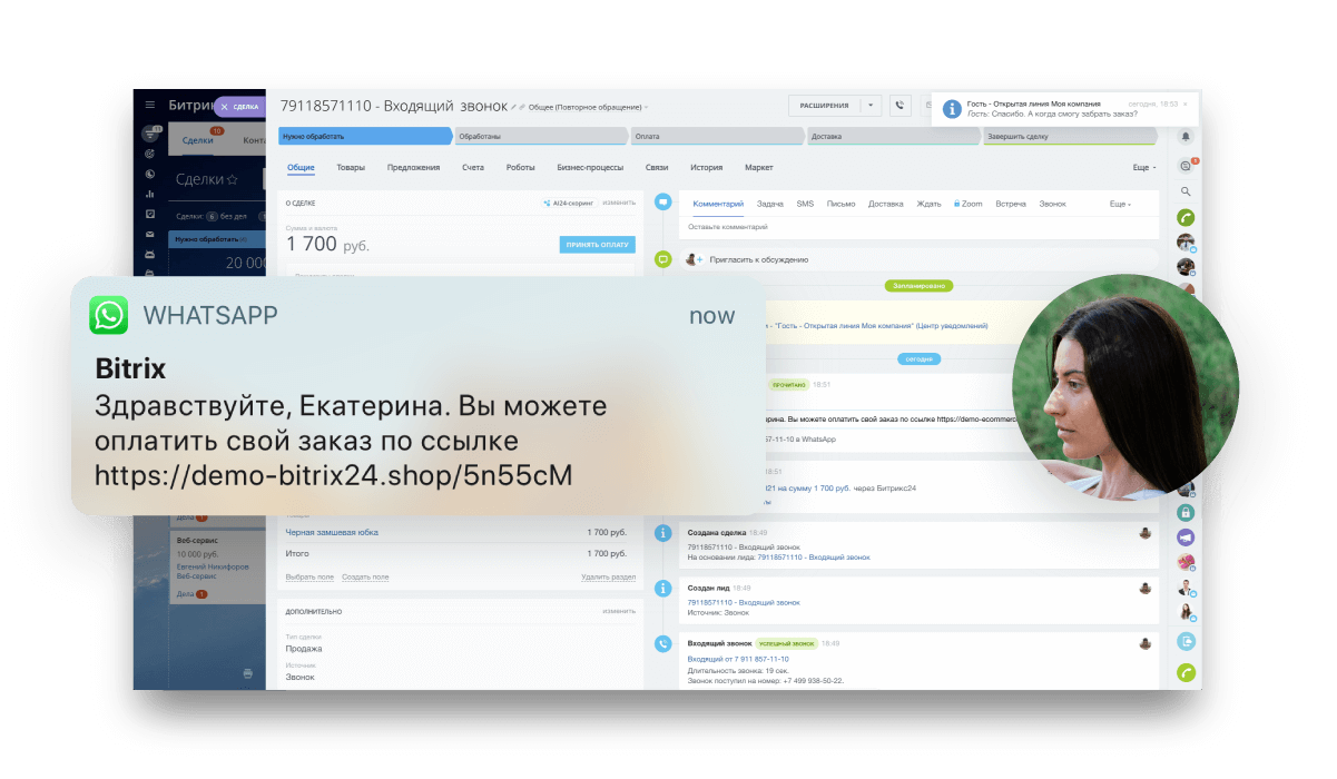 Битрикс24 сам распознает в вашем клиенте пользователя WhatsApp и отошлёт ему ссылку для оплаты заказа в чат. Тем самым у вас открывается новый канал коммуникации с покупателем. Менеджер проконсультирует, ответит на вопросы, предложит дополнительные товары.