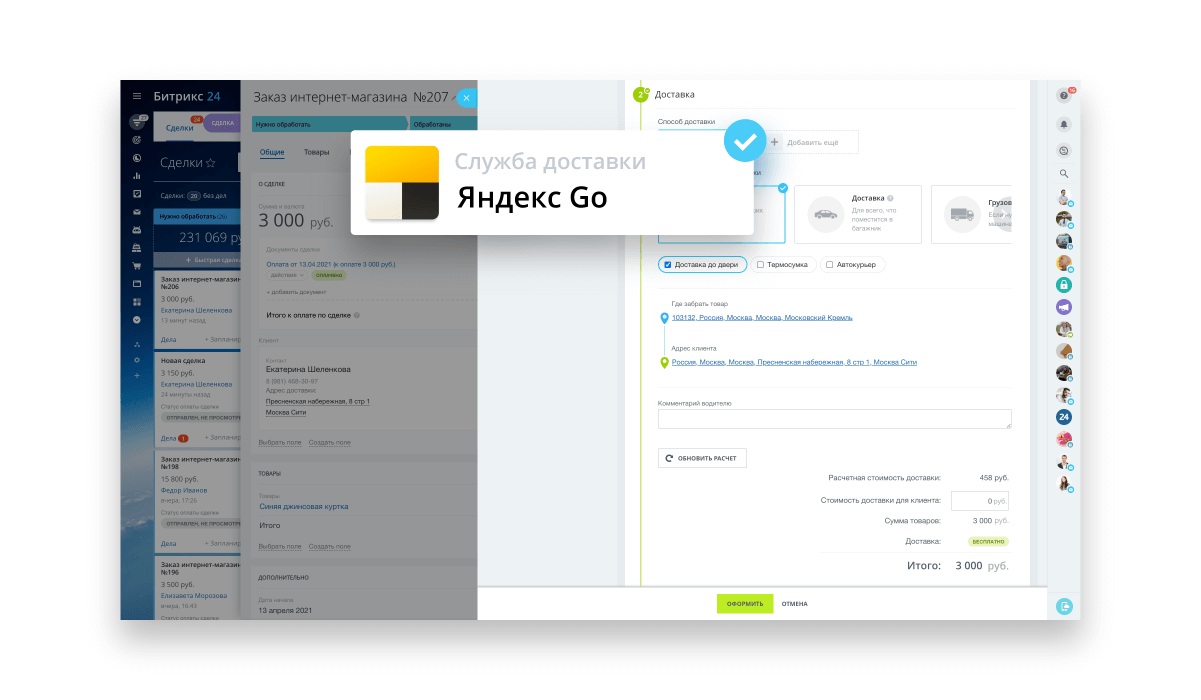 Заключите онлайн-договор с Яндекс Go прямо из Битрикс24 и сами выбирайте способы отправки товара: от курьера с термосумкой до грузовой машины с грузчиками. Не надо держать своих курьеров, автопарк и волноваться о простоях.