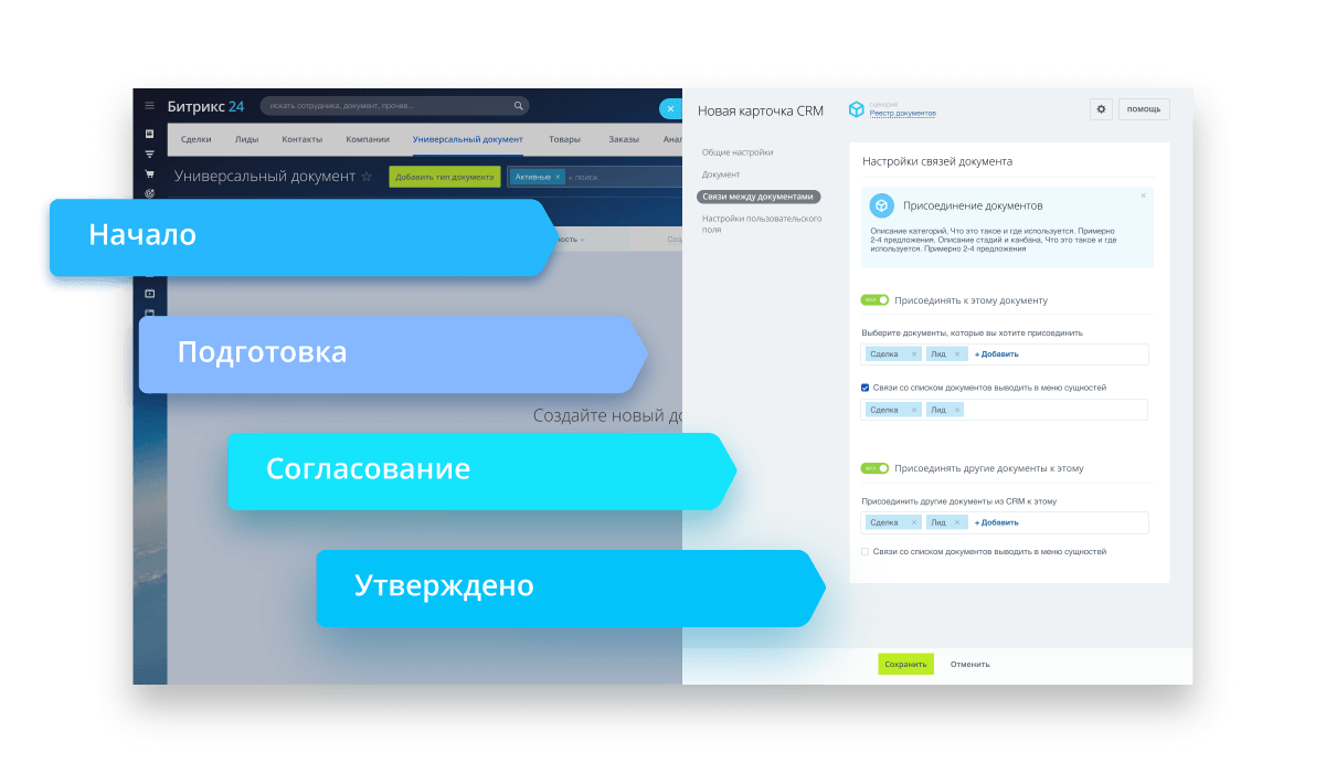 Автоматизировать рабочие места в компании теперь можно без привлечения программистов. Настраивайте необходимые вам стадии в канбане, создавайте карточки с нужными полями, связывайте свои смарт-процессы со сделками и предложениями. Смарт-процессы помогут, к примеру, организовать работу HR-отдела или отдела снабжения с их документами, воронками и стадиями.