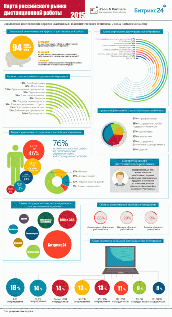 Результаты исследования показали, что каждый сотрудник, перешедший на удаленную работу и имеющий необходимое программное и аппаратное обеспечение, внесет свой вклад в экономику предприятия в размере 170 тыс. рублей за год за счет снижения расходов. Также, по прогнозам J’son & Partners Consulting, в ближайшие 5 лет Россию ждет взрывной рост удаленной работы. Уже к 2020 году каждый 5-ый сотрудник компании будет работать удаленно. Совокупная экономия от этого перехода составит более 1 трлн рублей.