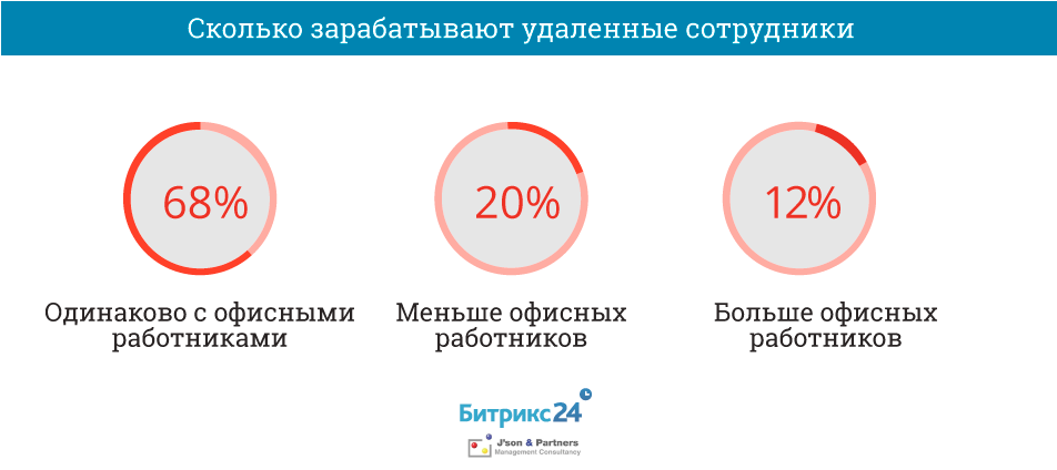 В рамках исследования был проведен опрос руководителей компаний среднего, малого и крупного бизнеса в 15 регионах, которые имеют в подчинении удаленных сотрудников. Результаты исследования показывают, что работа вне офиса уже не воспринимается как «неполноценная», и руководители рассматривают ее как реальную альтернативу офисной. Об этом говорит уровень заработной платы, который компании готовы устанавливать для дистанционных сотрудников. В 68% опрошенных компаниях размер зарплаты не зависит от того, в офисе работает сотрудник или нет, а в 12% компаниях дистанционные работники получают даже больше офисных.