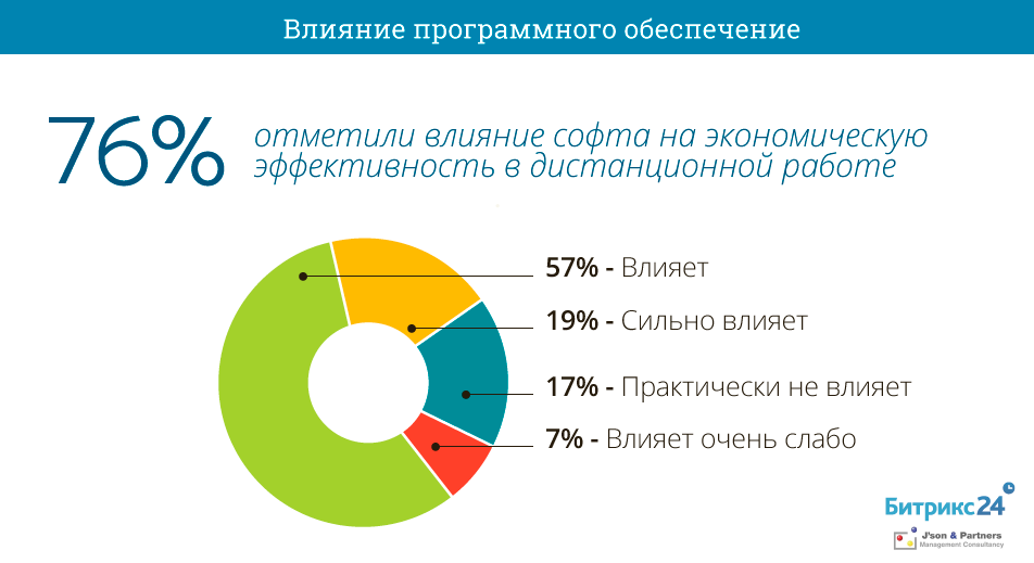 Вне зависимости от бренда и разновидности, ПО играет ключевую роль в развитии рынка дистанционной занятости. Польза специализированных сервисов для дистанционной работы очевидна бизнесу. Исследование показало, что 83% компаний, использующих сервисы для организации работы сотрудников вне офиса, отмечают их влияние на экономическую эффективность бизнеса. При этом 19% оценивают это влияние как сильное, и 57% как среднее и только 7% как слабое.