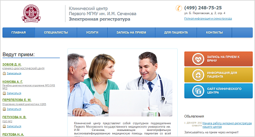 19 организаций Первого Московского государственного медицинского университета им. И.М. Сеченова используют в своей работе готовое отраслевое решение «1С-Битрикс: Сайт медицинской организации». Решение хорошо совместимо с платформой «1С:Медицина. Больница», на которой построена комплексная автоматизация клиник. Это позволило разработчикам проекта – «Группе Махаон», организовать электронную регистратуру, интегрировав ее с медицинскими информационными системами (МИС).