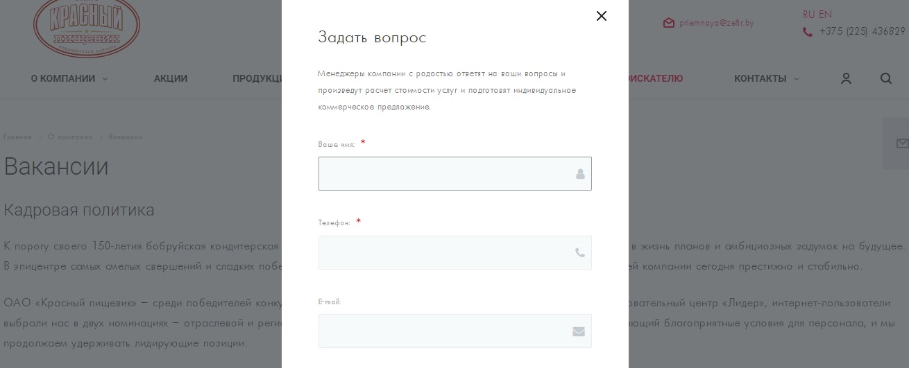 Сайт позволяет не только знакомиться с продукцией, но и читать данные относительно франчайзинга, пресс-центра, контактов. При необходимости пользователи зададут вопрос владельцу сайта онлайн.