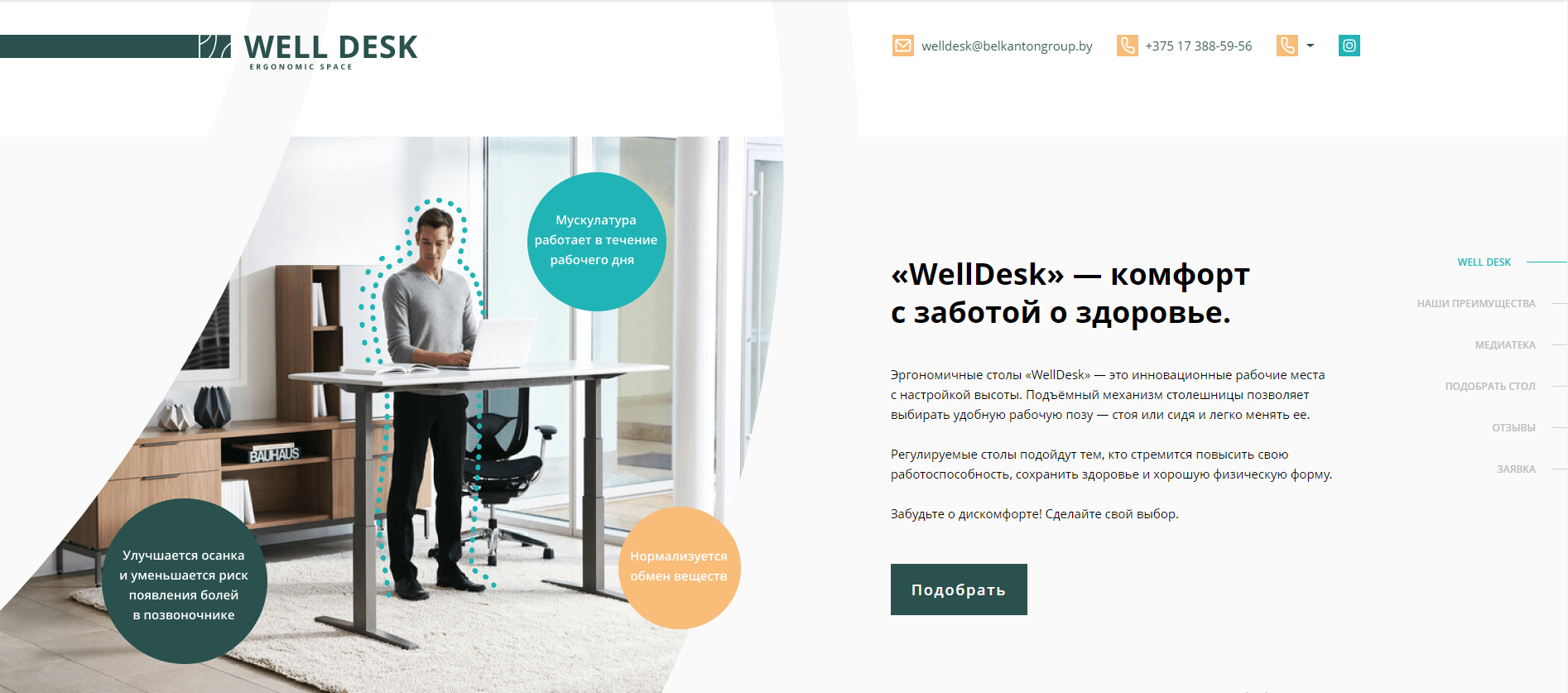 Мы разработали быстрый производительный одностраничный промо-сайт на 1С-Битрикс. Ключевой ценностью проекта является конфигуратор, используя который пользователь может подобрать нужный себе вариант стола Well Desk