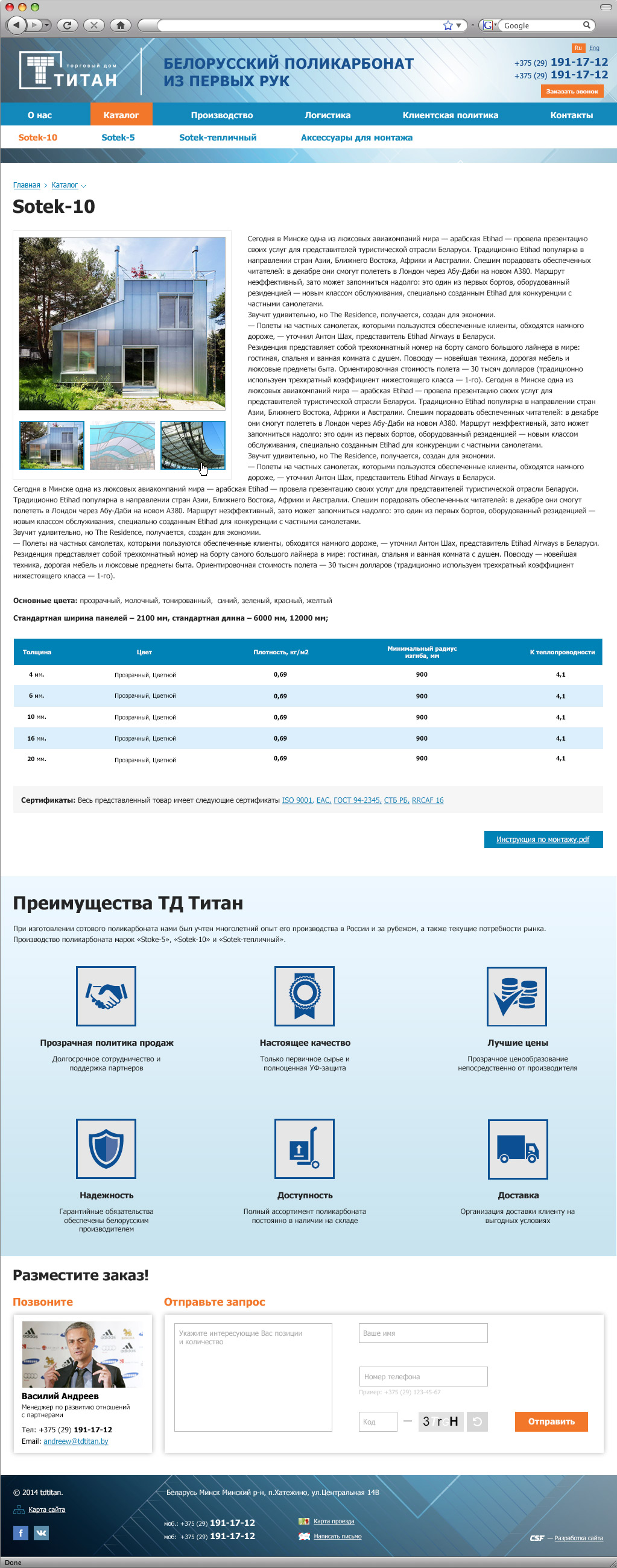 Корпоративный сайт Торгового дома с представлением всех важных для клиента преимуществ. Обладает каталогом товаров, лендингом Производство, Логистика, Клиентская политика, необходимыми механизмами конверсии трафика: контактными телефонами, формой обратной связи, контактной формой, карточкой менеджера, привязанной к типу продукции, формой отправки запроса данному менеджеру. Дополнительно сайт снабжен укороченной английской версией - краткий лендинг для англоязычных посетителей.