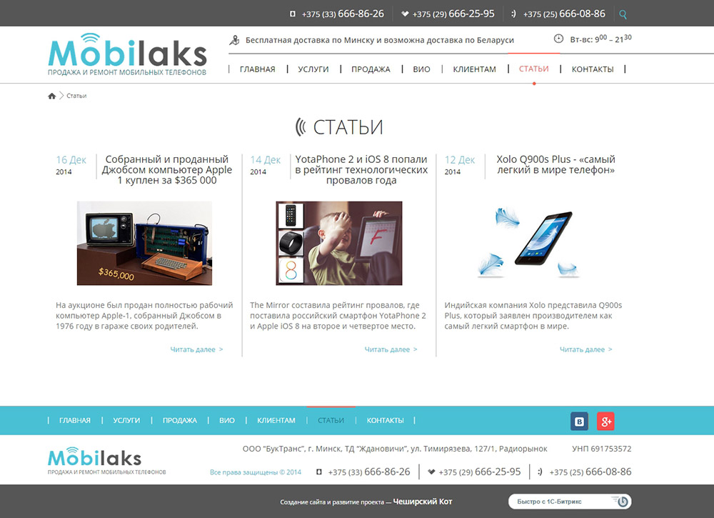 Сотрудники Mobilaks выполняют срочный ремонт, который занимает до 2 часов, курьерская доставка при ремонте и бесплатная доставка при покупке мобильного телефона по Минску, а также доставка по городам Беларуси. На счету магазина Mobilaks сотни довольных клиентов, которые обратились за покупкой или ремонтом своего мобильного телефона.