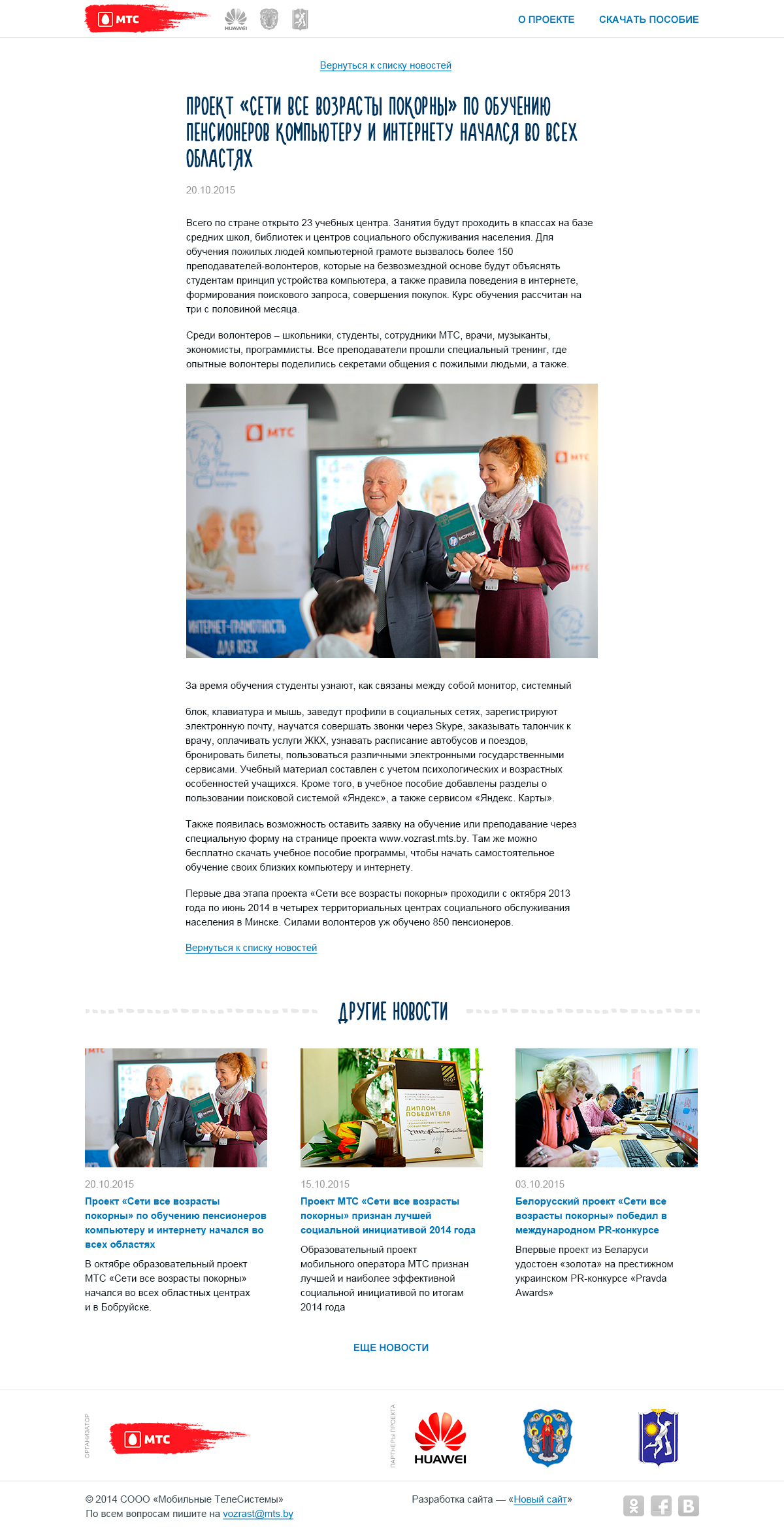 Социальная инициатива компании Мобильные ТелеСистемы (МТС) «Сети все возрасты покорны» адресована представителям старшего поколения и направлена на сокращение цифрового неравенства между различными возрастными группами, адаптацию в информационном обществе и повышение интернет-грамотности. Преподавательский состав проекта полностью состоит из волонтеров, среди которых студенты белорусских вузов, сотрудники МТС и IT-компаний, а также пенсионеры, которые уже овладели необходимыми навыками пользования компьютером и интернетом. С начала работы программы диплом об окончании курсов компьютерной и интернет-грамотности «Сети все возрасты покорны» получили более 2 000 пожилых людей Беларуси.