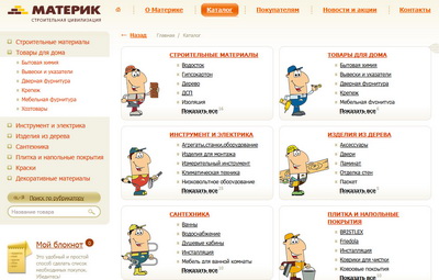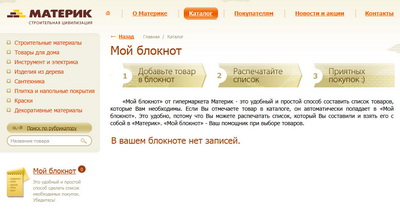 Для быстрого нахождения нужных товаров на сайте организован поиск по рубрикатору, а для удобного формирования списка покупок специальная функция "Мой блокнот". В разделе "Интерактивная карта "Материка" те покупатели, которые не любят долгих блужданий по гиппермаркету, могут сразу увидеть нужную им секцию путем простого наведения курсора мыши на интересующий раздел продукции.<br />