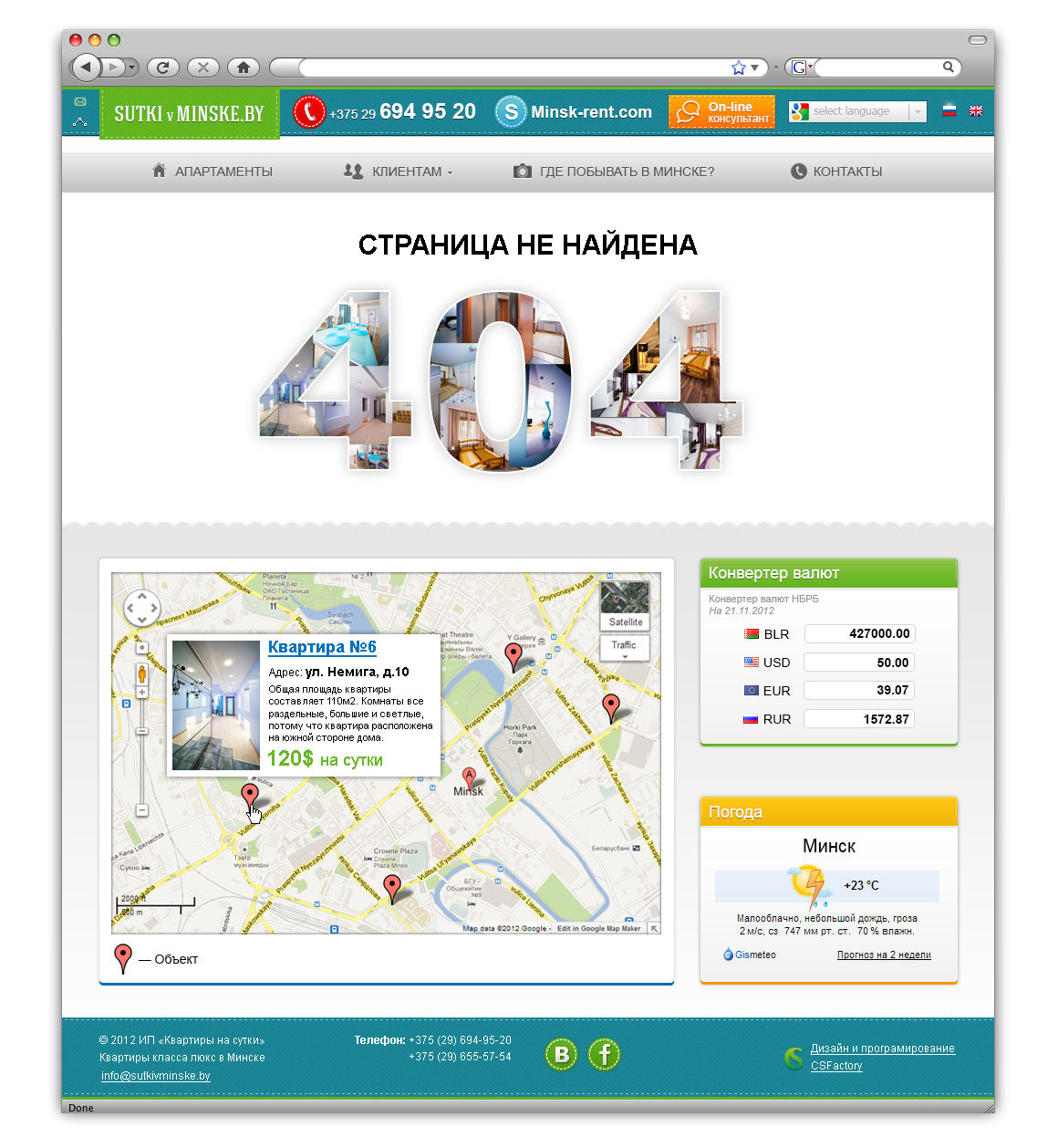 На сайте представлен список апартаментов с описанием, конвертер валют, карта Минска с адресами апартаментов, информация о наиболее интересных мест для посещения в городе Минске.